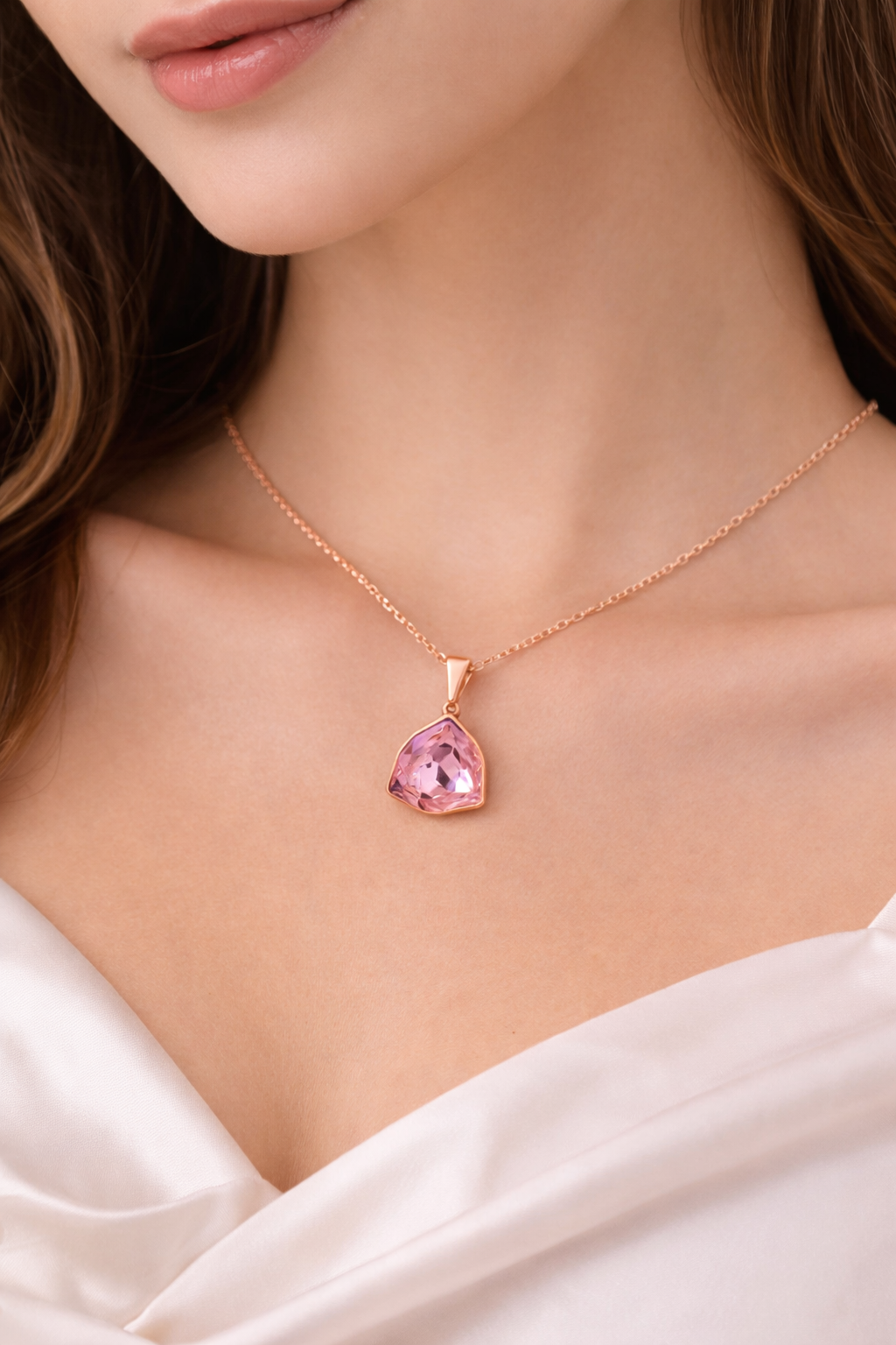 Luce un estilo delicado y sofisticado con este hermoso collar bañado en oro, diseñado con un elegante dije de cristal en tono rosa que refleja luz y resalta tu belleza natural. Su diseño minimalista y moderno lo convierte en el complemento perfecto para cualquier ocasión, desde el uso diario hasta eventos especiales.