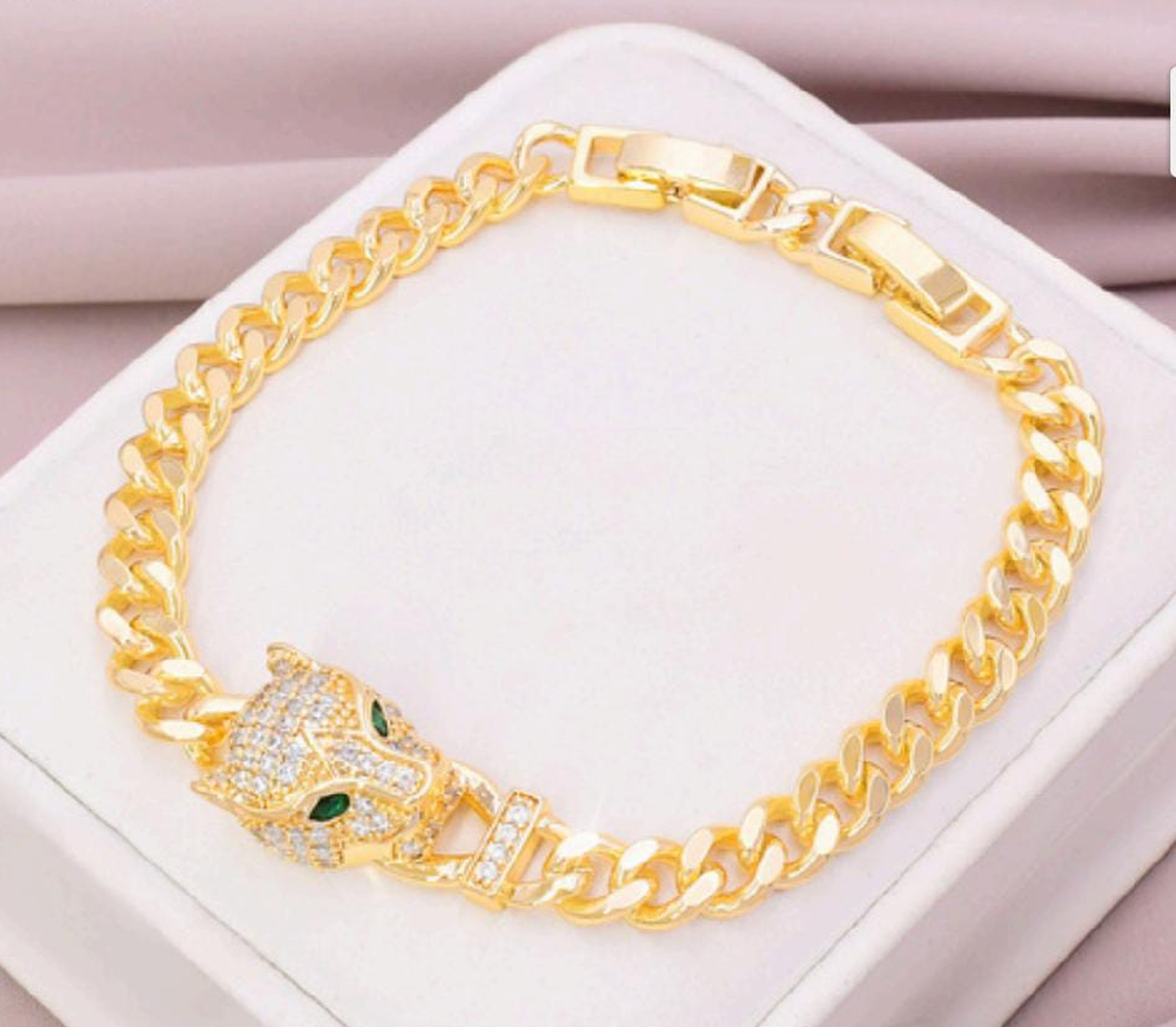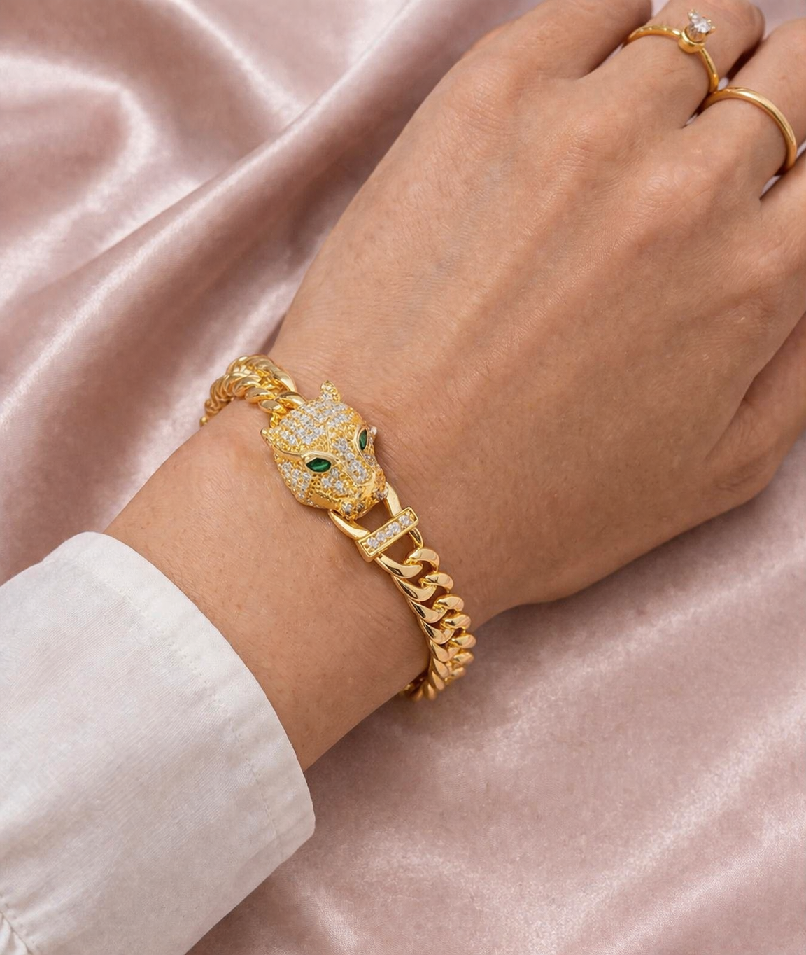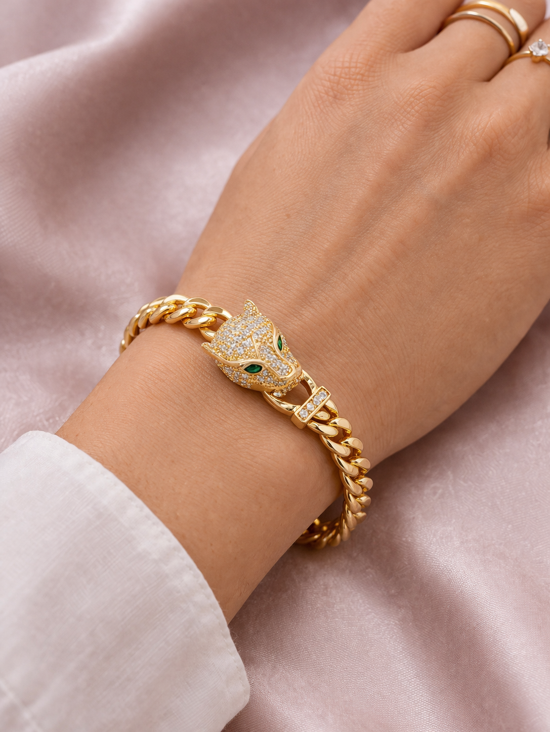 Destaca con esta imponente pulsera bañada en oro 18K, diseñada con una elegante cadena tipo cubana y un exclusivo detalle de pantera que simboliza fuerza, estilo y distinción. Sus acabados brillantes y su diseño robusto la convierten en una pieza única que aporta un toque de lujo a cualquier outfit.