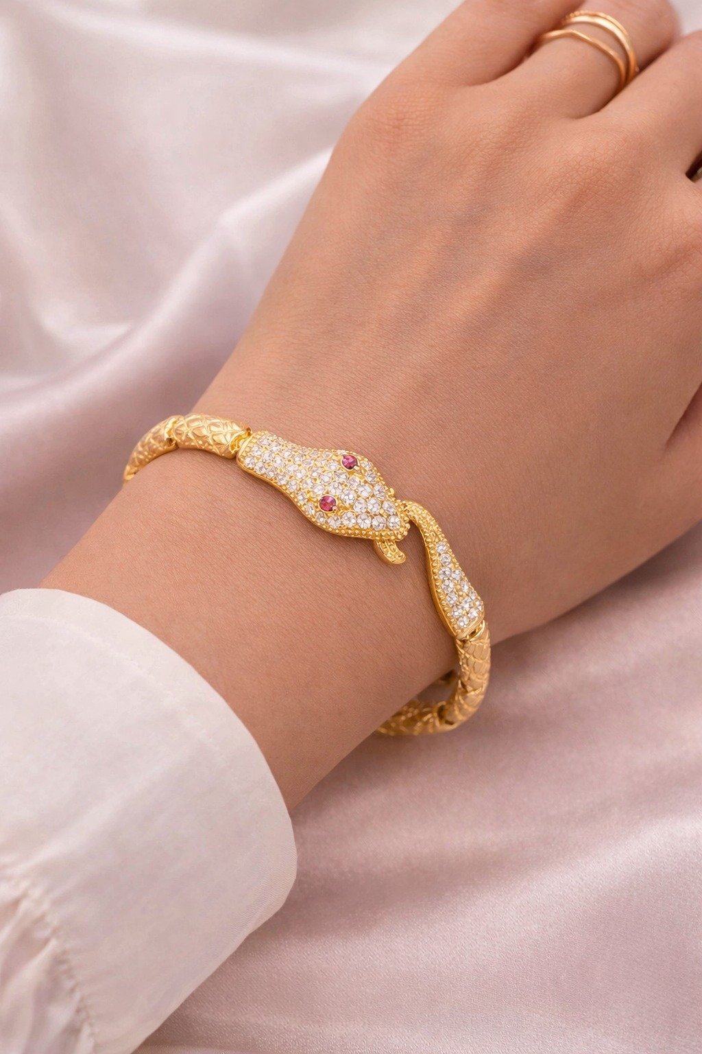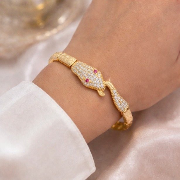 Descubre la elegancia y el estilo en una sola pieza con esta exclusiva pulsera bañada en oro 18K. Su diseño tipo serpiente, símbolo de sofisticación y poder, está cuidadosamente elaborado con detalles brillantes que capturan la luz y aportan un acabado lujoso.
